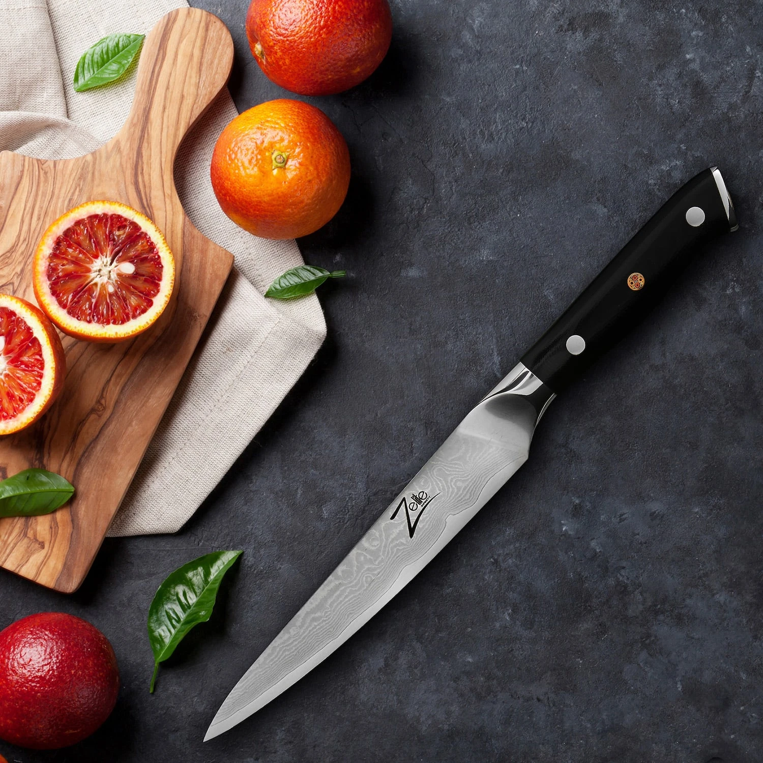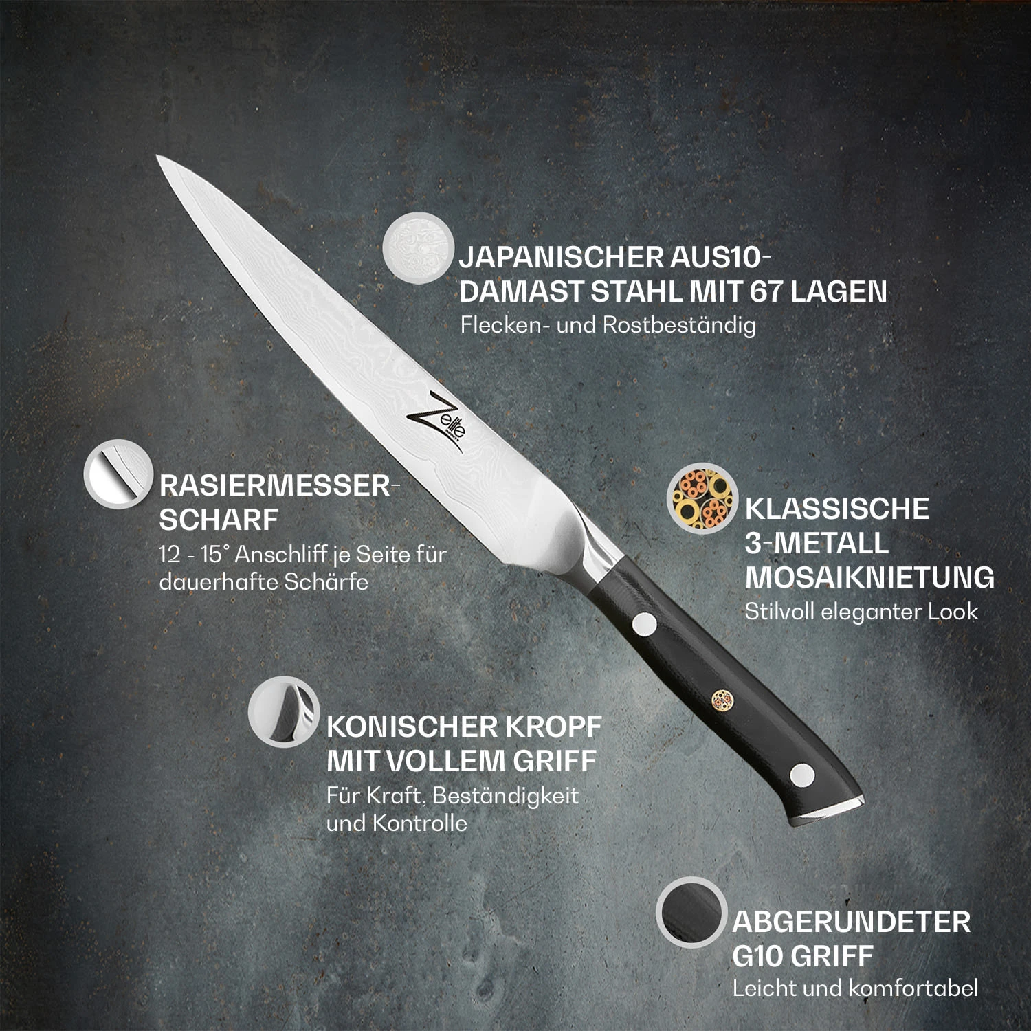 Exklusive Präzisionsmesser nach japanischem Vorbild: Die handgeschliffene Zelite Infinity by Klarstein Alpha-Royal Japanese Messerserie erfüllt hohe Ansprüche bei jeder Kochkunst. Insgesamt 67 Schichten bilden als hochwertiger, japanischer Damaszener-Stahl übereinanderliegend die changierende Klinge. Durch eine perfekt ausbalancierte und ergonomische Formgebung und einen nahtlosen, dreifach vernieteten Griff aus G10-Glasfaser liegen die eleganten Küchenwerkzeuge wunderbar in der Hand. Hier verbinden sich Schärfe, Haltbarkeit, Gewicht, Kontrolle und Handhabung mit außergewöhnlichem Design, perfektioniert durch eine kunstvolle 3-Metall-Mosaikniete im Griff.