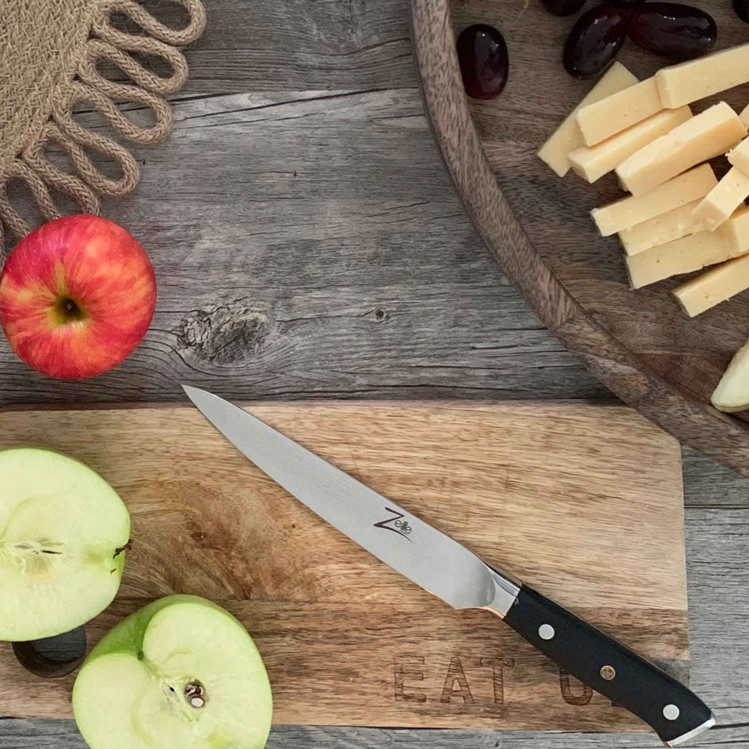 Allzeit bereit: In einer modernen Küche darf ein praktisches Allzweckmesser nicht fehlen. Da ist das 6″ Allzweckmesser der exquisite Generalist der Infinity by Klarstein Alpha-Royal Japanese Serie. Wo ein Messer zu groß fürs Entkernen von Gemüse, wiederum ein anderes zu klein zum Zerteilen von Obst oder Fleisch ist – dort findet das windige Universalmesser seine Passion. Dank hervorragender Schnitthaltigkeit hinterlässt es besonders feines Schnittgut, dabei haftet dank dem Klingenfinish nichts am Messer. So ist das vielseitig einsetzbare Qualitätsmesser stark beim Zerteilen von Mangos oder Grapefruits, Schneiden von Zucchinis, Würfeln von Fleisch oder auch beim Kartoffelschälen.