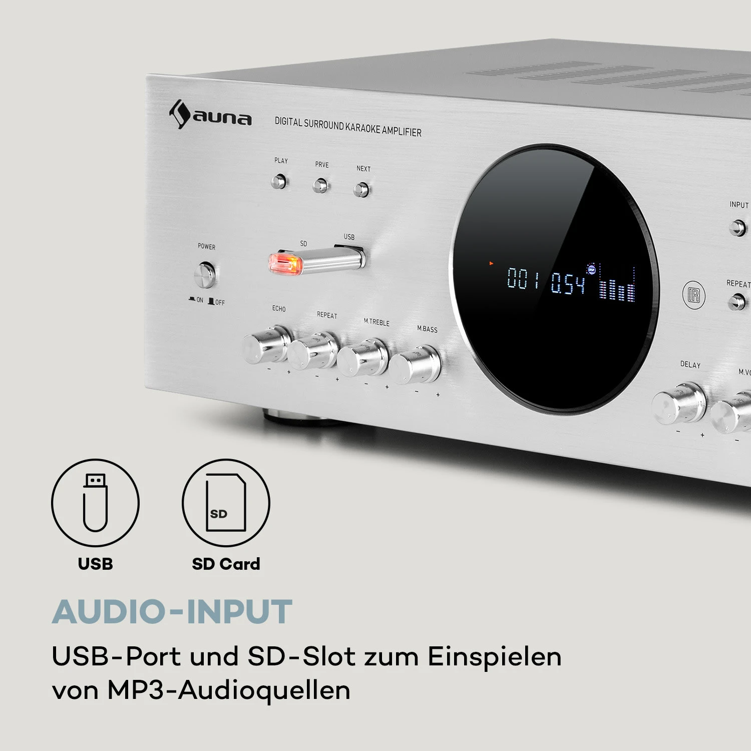 Ausgestattet mit einer Bluetooth-Schnittstelle können sämtliche Audio-Dateien innerhalb einer Entfernung von 20 Metern drahtlos und bequem von Smartphone oder Tablet über den auna AMP-218 BT 5.1 Digital-Verstärker abgespielt werden. Zusätzlichen Audio-Input erhält der Verstärker wahlweise über den AUX-Eingang von CD-Player oder Stereoanlage, per DVD-Eingang oder via USB-Port und SD-Slot von Massendatenträgern. Zwei frontseitige Mikrofoneingänge machen den Verstärker zur vollwertigen Karaokemaschine bei der nächsten Heimparty mit Familie und Freunden. Selbstverständlich können die Signale in Lautstärke, Bass und Treble geregelt sowie mit Echo, Repeat und Delay Effekten versehen werden.