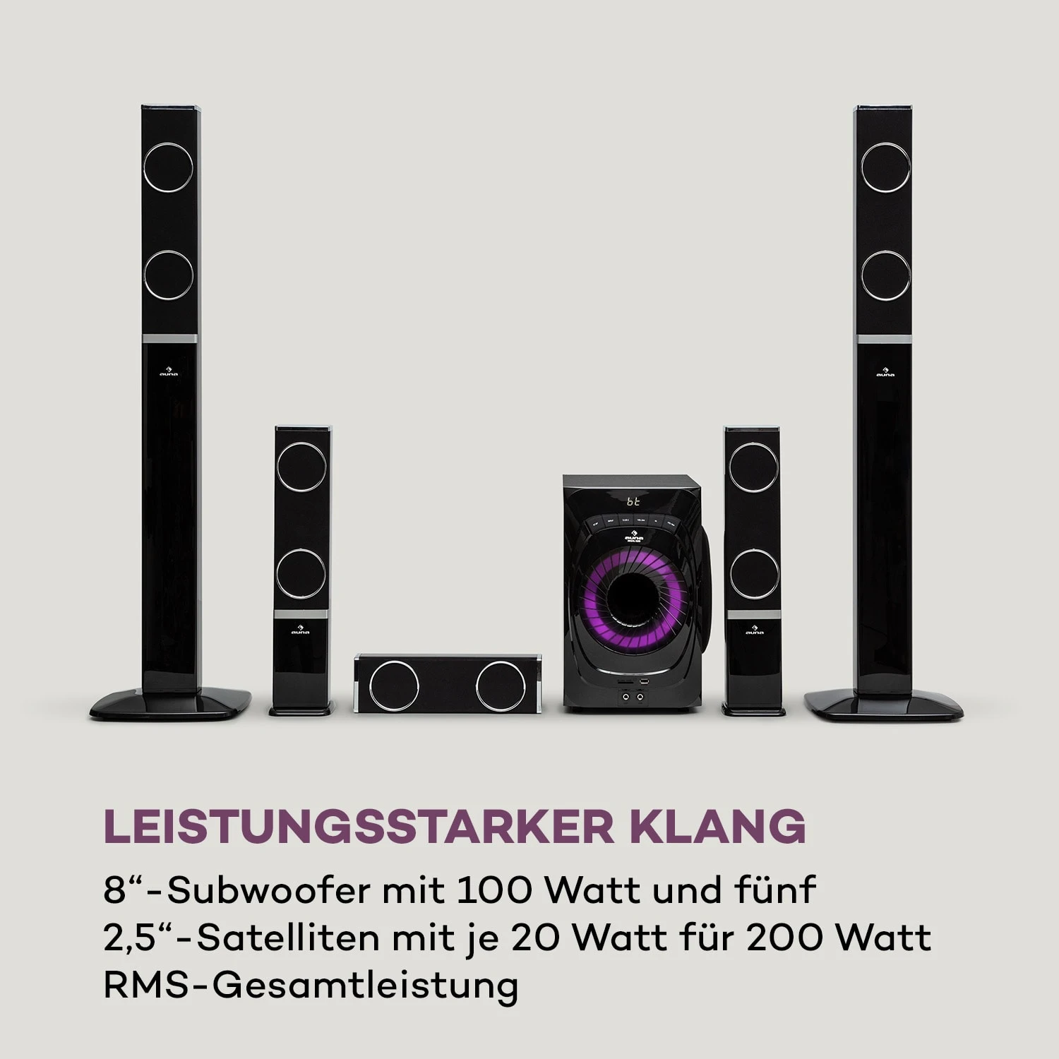 - RMS-Leistung: 5 x 20 Watt (Satelliten), 1 x 100 Watt (Subwoofer)