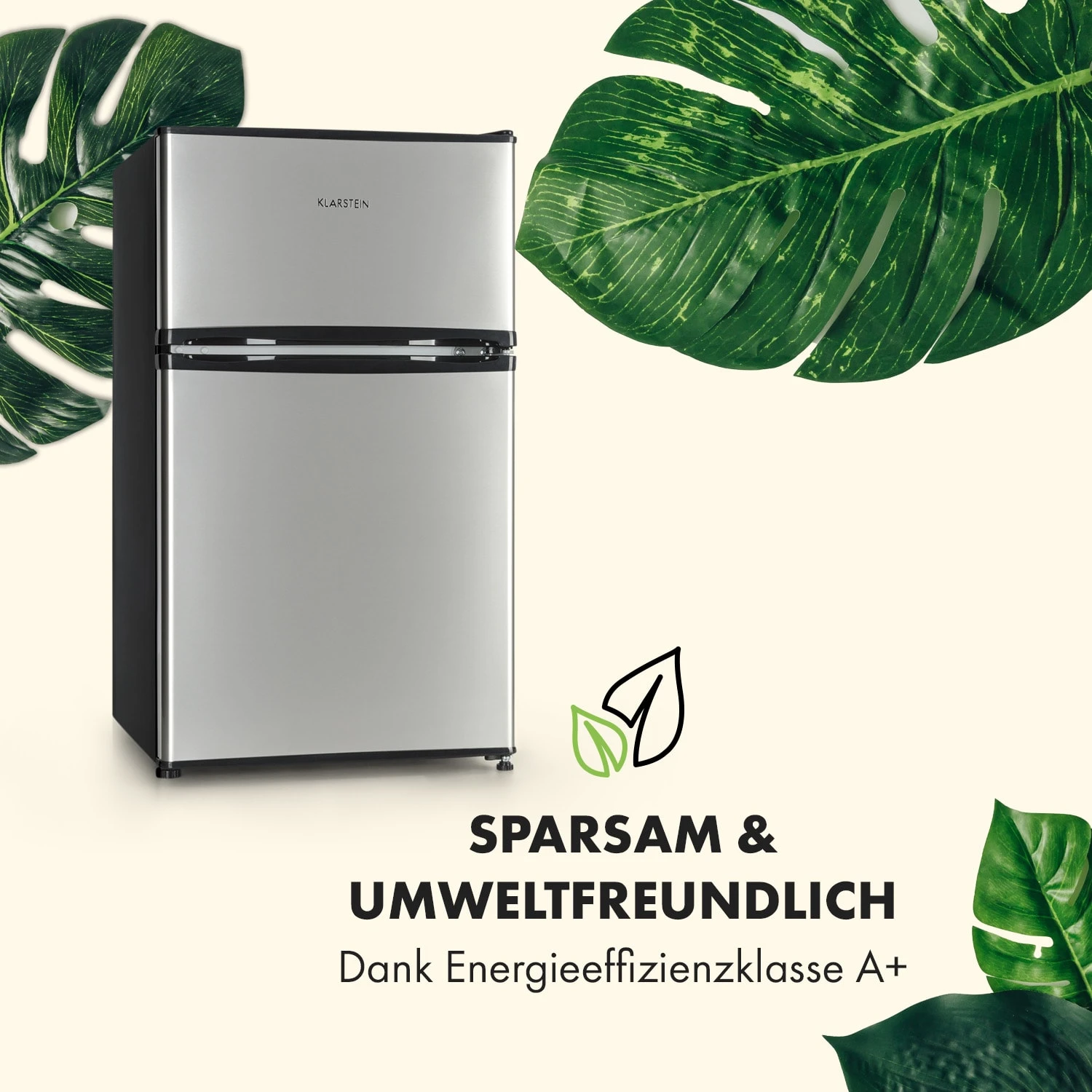 Stay cool! Die Klarstein Big Daddy Cool Kühl-Gefrierkombination mit einem Gesamtfassungsvermögen von 86 Litern bringt Ordnung und Übersicht in die Frischhaltung der Lebensmittel von Kleinhaushalten. Mit zwei herausnehmbaren Glas-Einschüben, dem separaten Gefrierfach und einem extra kühlen Crisper-Fach für Obst und Gemüse ist reichlich Platz für die optimal gekühlte Aufbewahrung – dabei nimmt der verbrauchsarme Kühlschrank in deiner Küche nicht viel Raum ein.