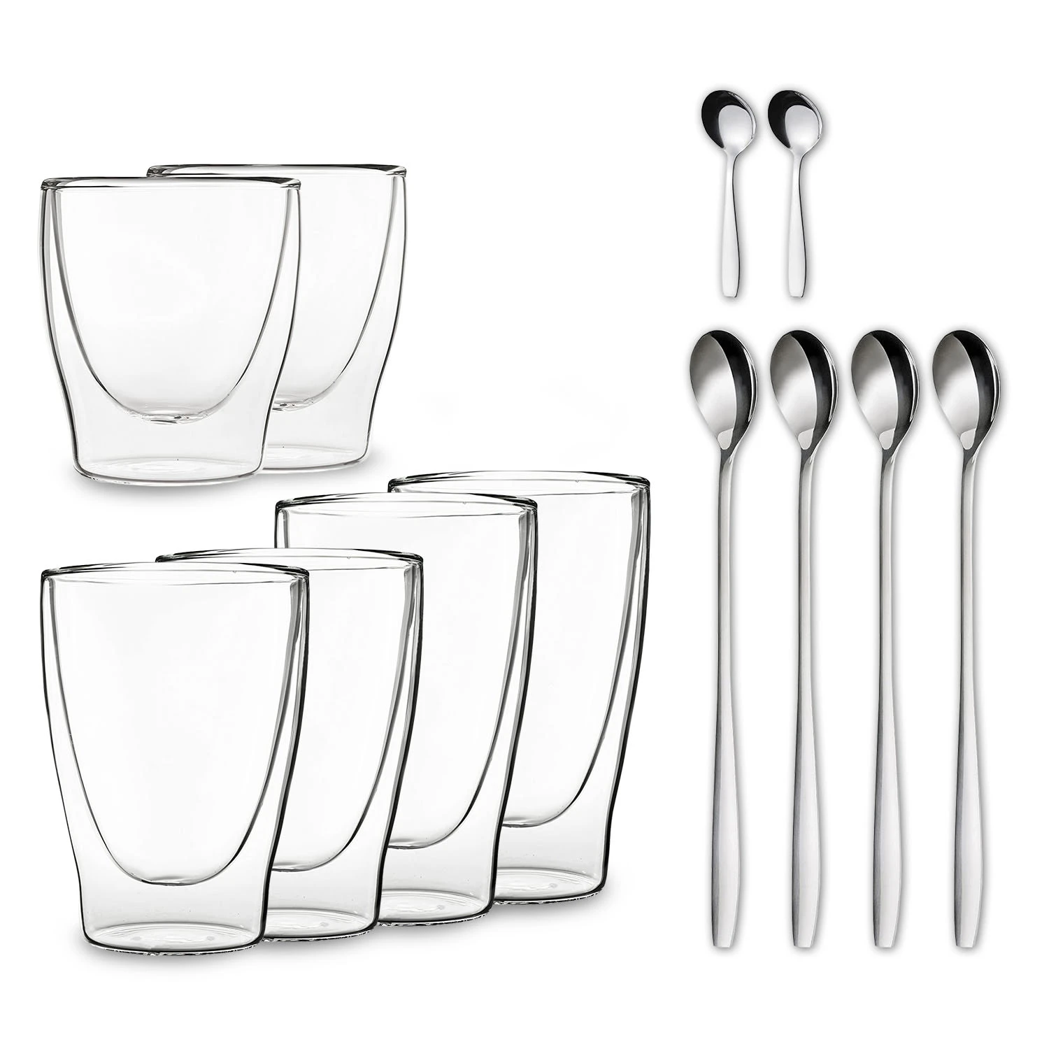 Das edle DUOS Trinkglas von Feelino by Klarstein ist handgefertigt und bereichert dein Wohnambiente mit seiner eleganten Formgebung. Die doppelwandige Glasschicht hält dabei kalte Getränke länger kalt und warme länger warm. Die Fertigung aus Borosilikatglas macht das ansehnliche Gefäß für Espresso, Tee, Shots, Aperitifs oder Nachspeisen besonders resistent und hitzebeständig: Es ist kratzfest, sehr leicht und natürlich spülmaschinengeeignet. Das Doppelwand-System sorgt zusätzlich für einen verblüffenden optischen Effekt, durch den die Flüssigkeiten zu schweben scheinen. Ein mitgelieferter Edelstahl-Löffel pro Glas macht das Gläserset perfekt!