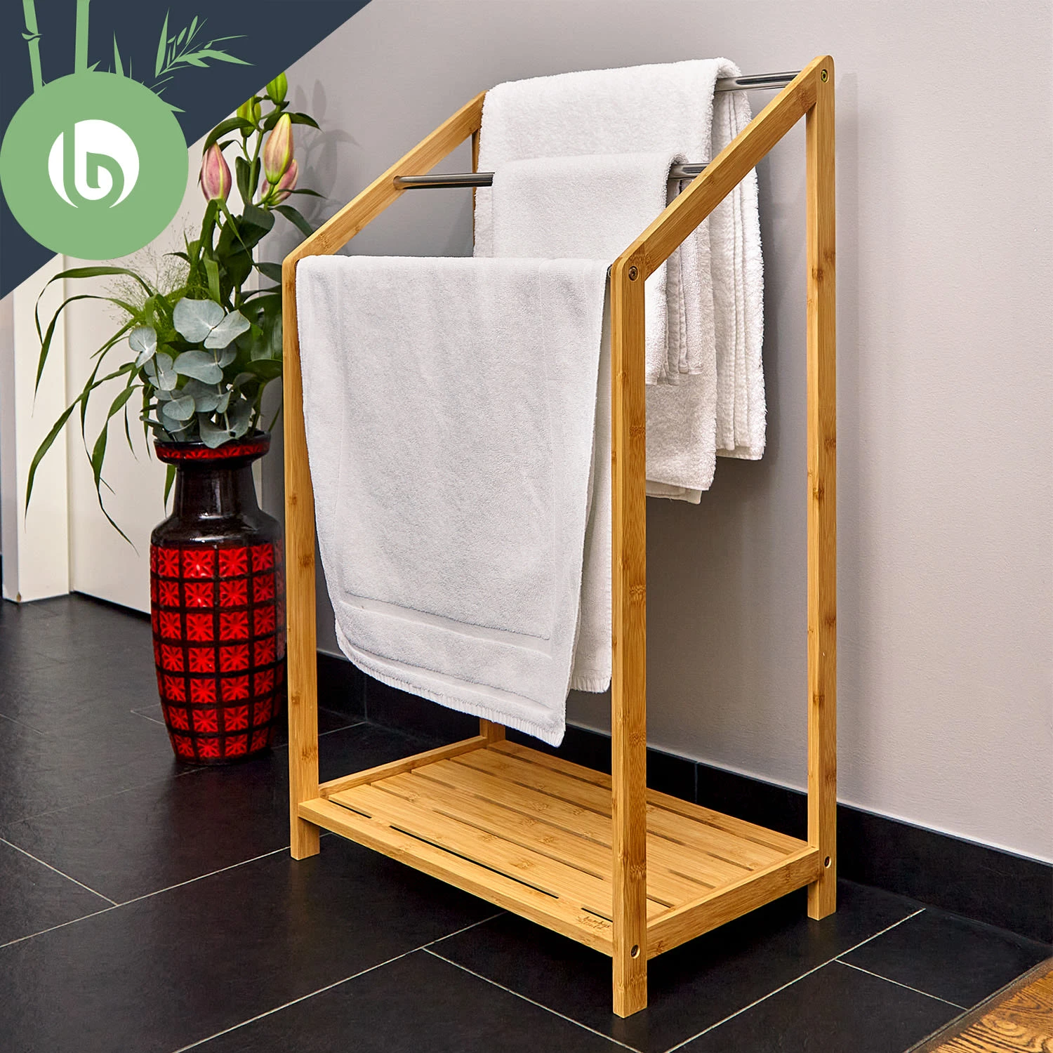 Wer kennt das nicht? Das Handtuch ist im Weg, denn es hängt über Badewannenrand oder Duschkabine. Es stört auf der Heizung oder kann nicht richtig trocknen, da es platzsparend aufgehängt werden muss. Damit ist nun Schluss, denn dank dem blumfeldt Handtuchhalter mit Metallstreben kannst du deine Handtücher perfekt ausbreiten und trocknen. Dazu ist der Handtuchständer eine pure Augenweide: kantig konstruiert und aus echtem Bambus hergestellt, kombiniert mit silberfarbenem Metall, wirkt er wie ein Designerstück fürs Badezimmer.