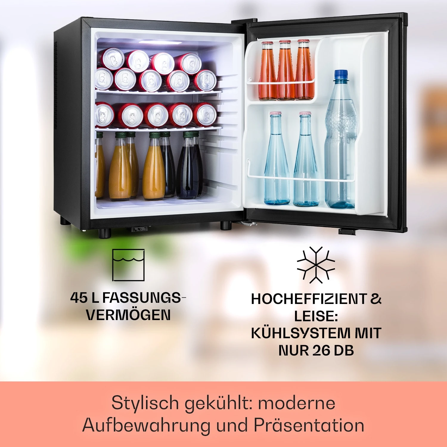 Platzsparend kühle Snacks und Drinks lagern: Der Happy Hour 45 Kühlschrank von Klarstein ist aufgrund seines besonders geräuscharmen Betriebs mit nur 26 dB und der kompakten Größe perfekt für kleine Haushalte, fürs WG-Zimmer oder Büro und besonders für Schlaf- und Gästezimmer geeignet. In seinem 45 Liter großen Innenraum finden auf 3 Ebenen allerlei Speisen, Getränke und Lebensmittel Platz. Zwei Gitterböden können auf acht Einschüben je nach Bedarf des Kühlschrankinhalts eingesetzt werden, während Eier, Butter und auch große Getränkeflaschen bis 2 Liter in den Türfächern Platz finden.