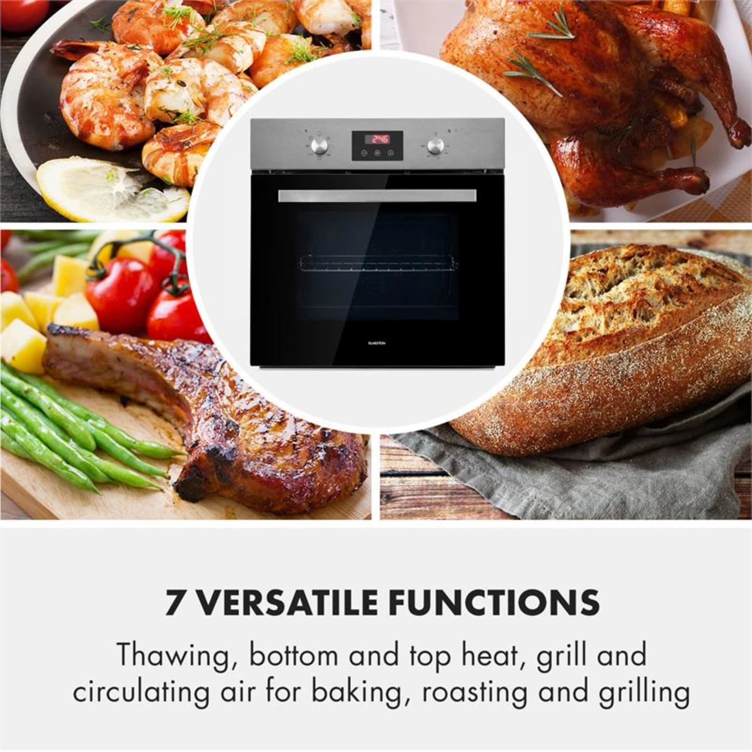 - 7 Funktionen: Auftauen, Ober- und Unterhitze, Umluft, einfaches Grillen, doppeltes Grillen, Grillen mit Umluft und Unterhitze mit Umluft