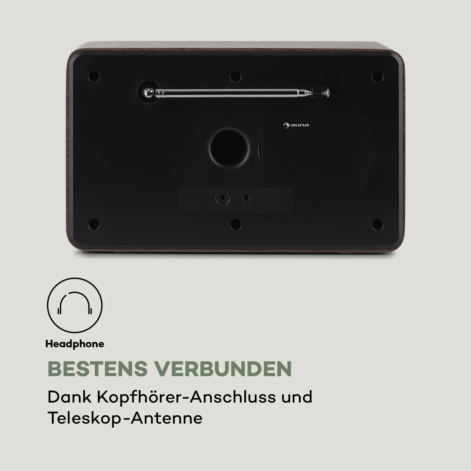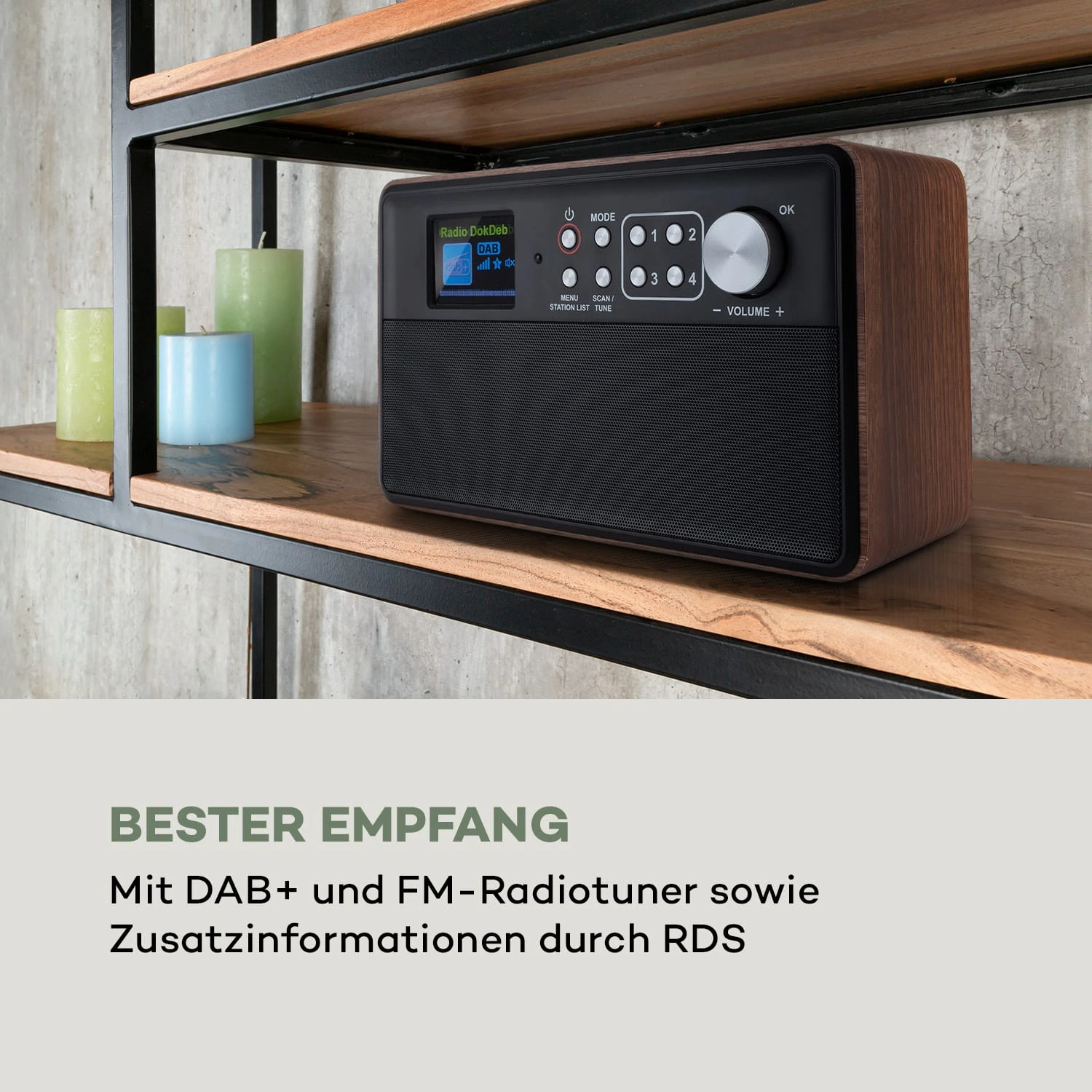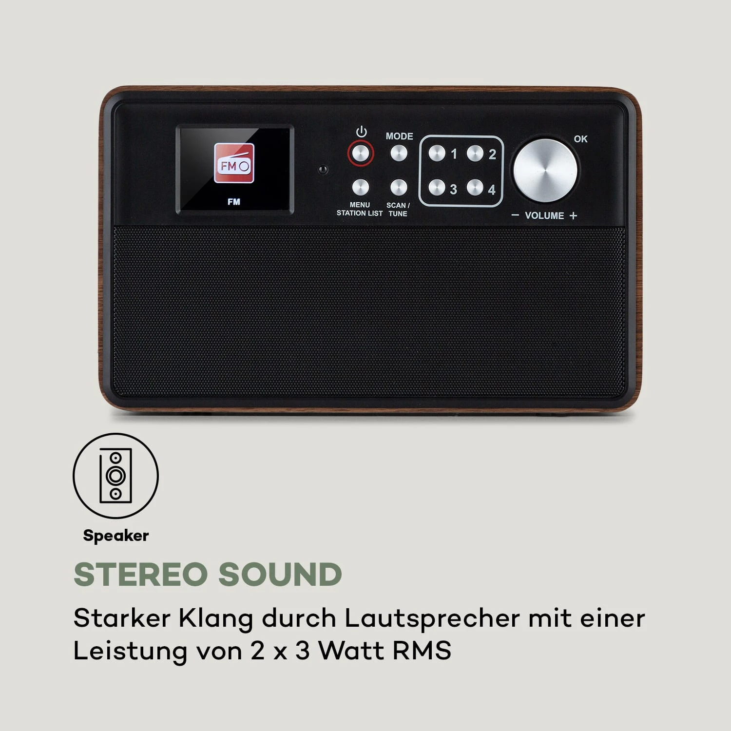 Die stilvolle Klangbox mit einer Leistung von 2 x 3 Watt RMS ist mit einem DAB+ sowie einem UKW-Radiotuner ausgestattet, die sowohl für den digitalen als auch analogen Empfang aller Sender in näherer Umgebung zuständig sind. Dank RDS werden außerdem nützliche Zusatzinformationen zu Radiostationen, Musiktiteln oder Alben angezeigt. Die Steuerung des Gerätes gestaltet sich durch das 2,4″ TFT-Farbdisplay mit extra großen Zahlen und Buchstaben jederzeit übersichtlich und erfolgt über die leichtgängigen Druckknöpfe am Gerät sowie mittels beiliegender Fernbedienung. Neben der vergrößerten Display-Anzeige sind für Senioren und Kinder vor allem die wählbaren Betriebsmodi vorteilhaft: So wird im Basismodus eine partielle Tastensperre ermöglicht, um eine Fehlbedienung und ein Verstellen der Einstellungen zu vermeiden. Nur die Ein-/Aus-Taste, die Einstellung der Lautstärke sowie die Tasten für 4 Speicherplätze sind hierbei freigegeben, während im Standardmodus sämtliche Funktionen, wie Sendersuchlauf, Senderlisten und Einstellungen freigeschaltet sind. Per Kopfhörer-Eingang kann zudem auch während der späten Abendstunden jederzeit dem Musikgenuss nachgegangen werden. Mit seinem eleganten und zurückhaltenden Design fügt sich das handliche Radio darüber hinaus perfekt in jedes Wohnambiente ein.