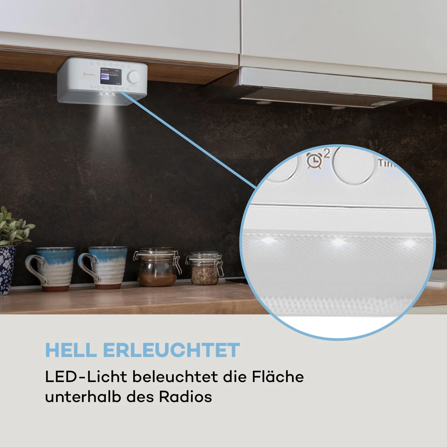 Mit dem integrierten DAB+ Tuner werden alle Radiosender zusätzlich zum analogen UKW-Signal digital empfangen und liefern höchste Soundqualität mit einem stabilen, rauschfreien Klangbild. Deine Lieblingssender können dabei dank der 5 Kurzwahltasten ganz einfach am Gerät gespeichert und ausgewählt werden. Durch das übersichtliche HCC-Farbdisplay behältst du beim Hören stets Uhrzeit, Radiosender und Titel im Blick. Über die Bluetooth-Schnittstelle kann auf einfache Art Musik von Smartphone und Tablet gestreamt und über die abwärts gerichteten Stereo-Lautsprecher mit einer Leistung von 2 x 1,5 Watt RMS wiedergegeben werden. Ein AUX-Eingang erweitert die Musikwiedergabe durch den einfachen Anschluss externer Geräte. Das Unterbauradio überzeugt darüber hinaus mit einem Küchentimer und kann unterhalb von Küchenschränken und Regalen angebracht werden. Ein integriertes LED-Licht beleuchtet zusätzlich die Arbeitsfläche unter dem Radio. Durch sein kompaktes und elegantes Äußeres, fügt sich das Küchenradio perfekt in jedes Küchenambiente ein.
