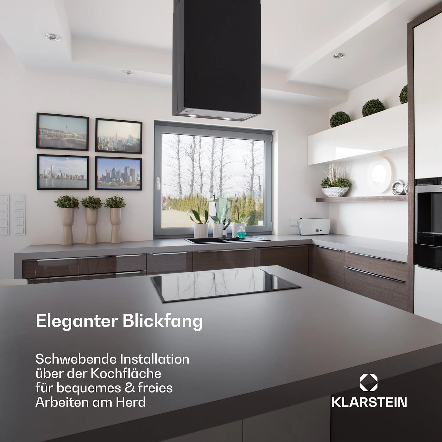 Die Abzugssäule wird stabil und sicher an der Decke befestigt und kümmert sich zuverlässig um entstehenden Küchendunst. In drei Leistungsstufen wälzt sie bis zu 624 m³/h Luft unermüdlich um und befreit so die Küchenluft von Fett und Gerüchen. Damit ist sie besonders für große Raumverhältnisse mit Kochinsel geeignet. In allen Betriebsstufen spendet eine zuschaltbare, integrierte LED-Kochflächenbeleuchtung helles, weißes Licht. Betriebsstufen und Licht werden ganz einfach über das frontseitige Bedienfeld gewählt. Die Inselhaube eignet sich sowohl zum Abluft- als auch Umluftbetrieb. Damit der Abluftschlauch dabei nicht zu sehen ist, verfügt sie über eine ca. 60 cm lange Kaminabdeckung, die sicher mit der Tragekonstruktion verbunden wird. Für den Umluftbetrieb sind optionale Aktivkohlefilter (Artikelnummer: 10030727) erhältlich, die die Luft zusätzlich von Gerüchen befreien. Absolut edel ist auch das äußere Erscheinungsbild der Klarstein Structura Inselabzugshaube. Das hochwertige, schwarze Edelstahlgehäuse verleiht jeder Kochinsel umstandslos einen edlen Glanz.