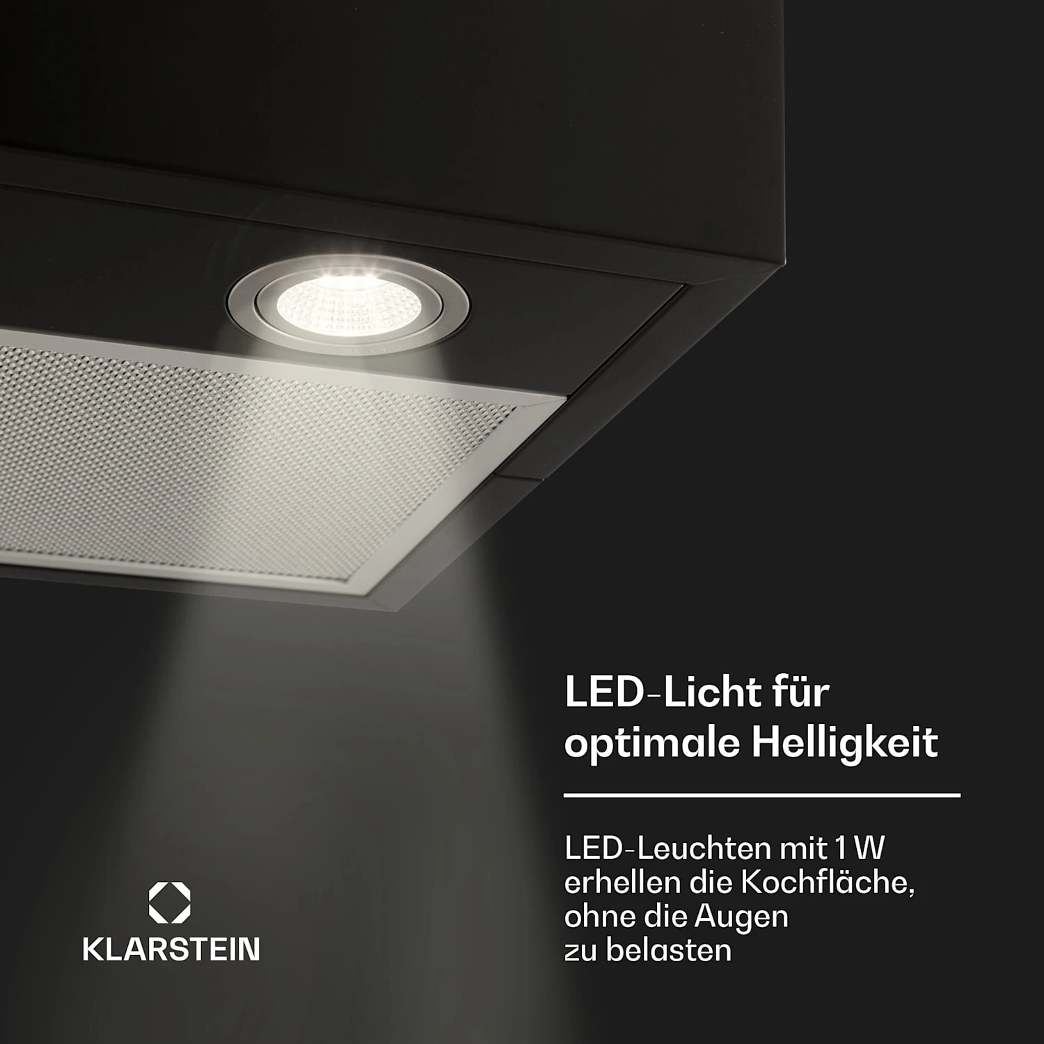 Die Structura Dunstabzugshaube von Klarstein: Stilvoller Blickfang, helle Kochflächenbeleuchtung und leistungsstarker Dunst- und Geruchsneutralisierer in einem Gerät.