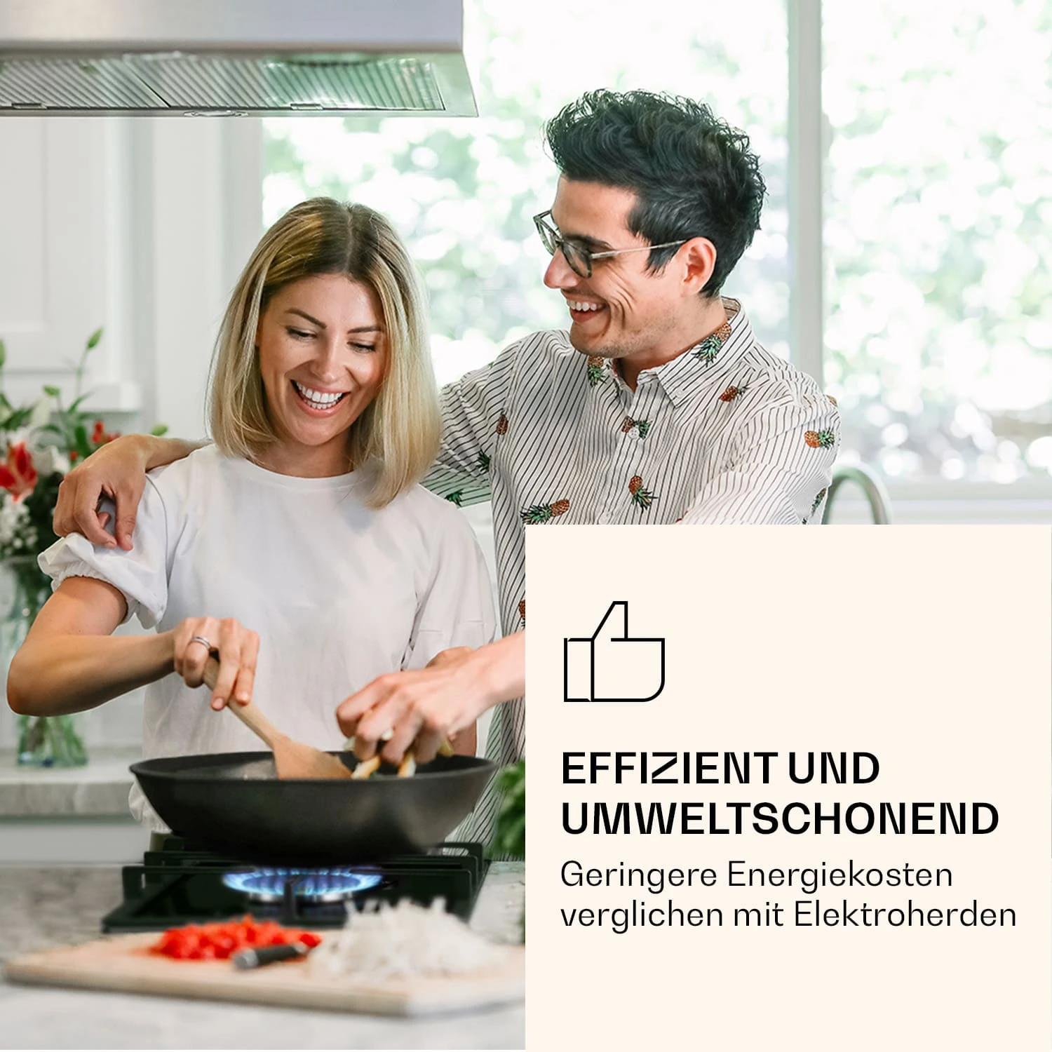 Auf dem platzsparenden Klarstein Victoria Domino Gaskochfeld befinden sich zwei hochwertige Sabaf-Brenner, die mit einer Leistung von 3 kW und 1 kW ordentlich einheizen. Die Brenner verteilen die Hitze gleichmäßig in der Mitte und an den Rändern deines Kochgeschirrs, so wird alles perfekt gegart. Die Bedienung ist dank der selbsterklärenden Symbole an den großen im Retro-Design gestalteten Drehknöpfen absolut intuitiv, die Hitzezufuhr kann während des Kochvorgangs immer wieder direkt angepasst werden. Via SnapJetIgnition entzündest du die Flamme, somit ist kein zusätzliches Feuer nötig. Das abnehmbare Kreuz aus massivem Gusseisen sitzt passgenau und kippsicher über den Flammen. Das Kochfeld ist mit einer gehärteten, pflegeleichten Keramikglas-Beschichtung versehen, die nicht nur gut aussieht, sondern auch besonders leicht zu reinigen ist.