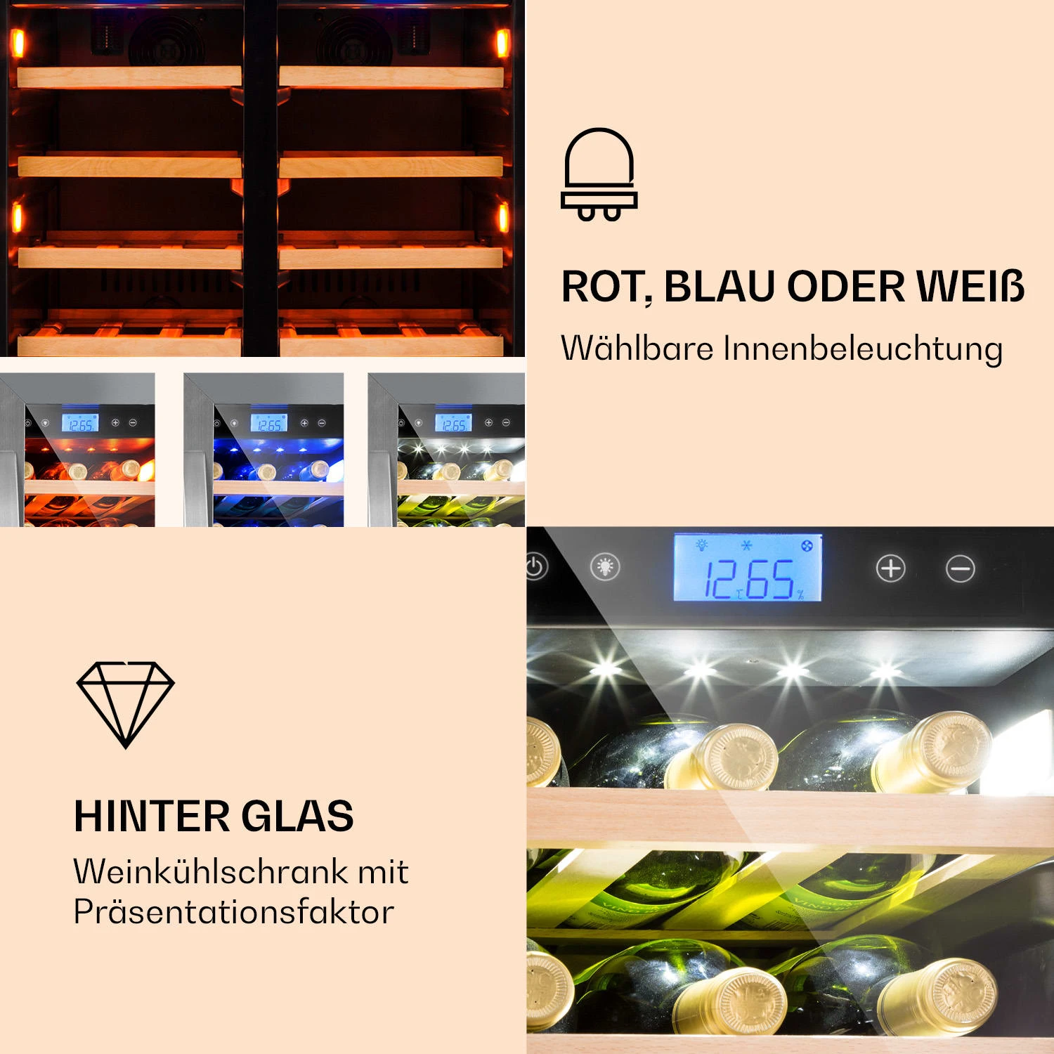 Edles Design und farbige Präsentation: Der Klarstein Vinovilla 42 Twin Built-In Duo Doppelzonen-Weinkühlschrank bietet edlen Weinvorräten eine gut gekühlte Bühne! Dank zwei verschiedenen Kühlzonen mit unterschiedlichen Temperatureinstellungen per Touch-Display kannst du mit ihm Rot- und Weißweine zeitgleich optimal lagern und kühlen.