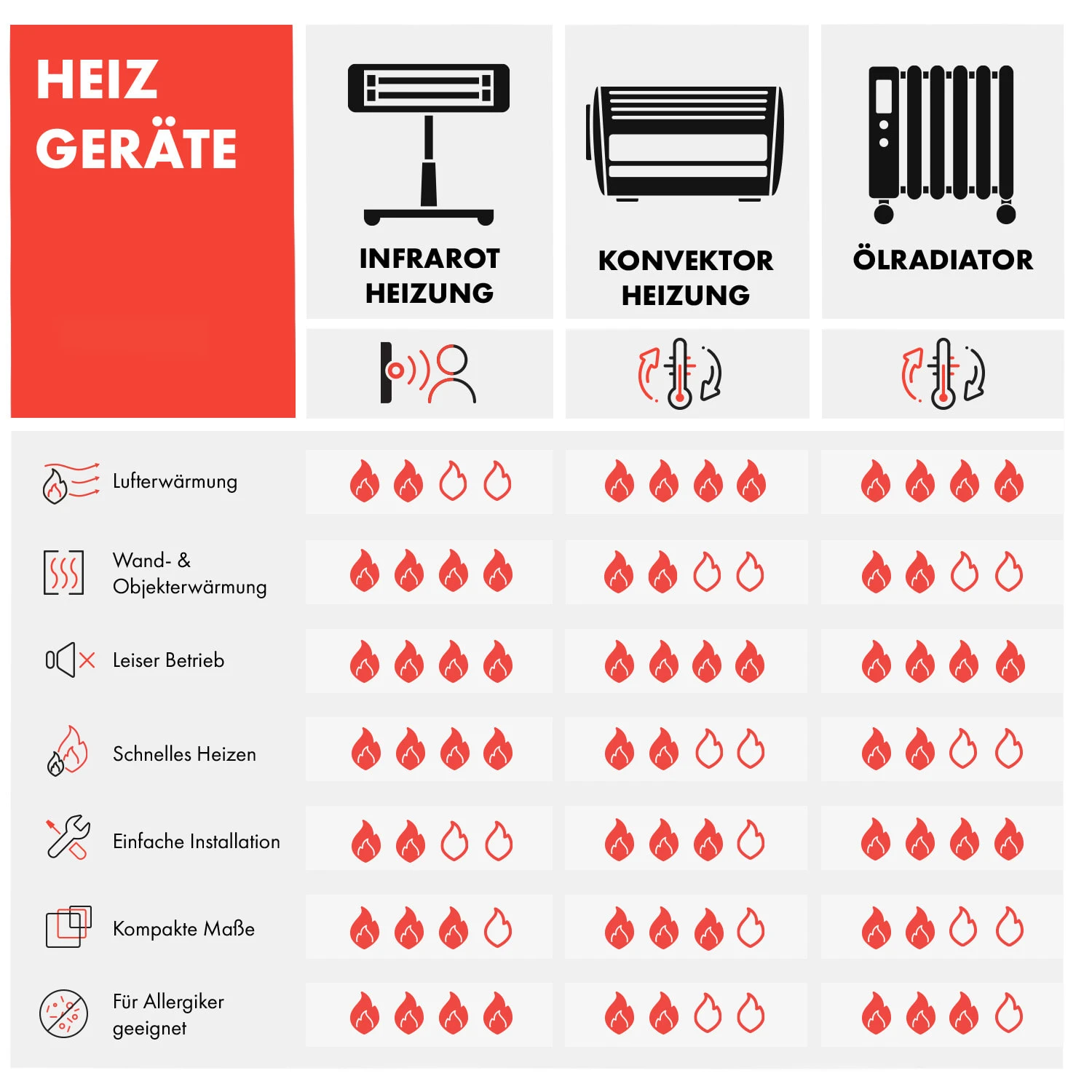 - Infrarotwärme: erwärmt angestrahlte Personen und Gegenstände, keine direkte Luftaufheizung